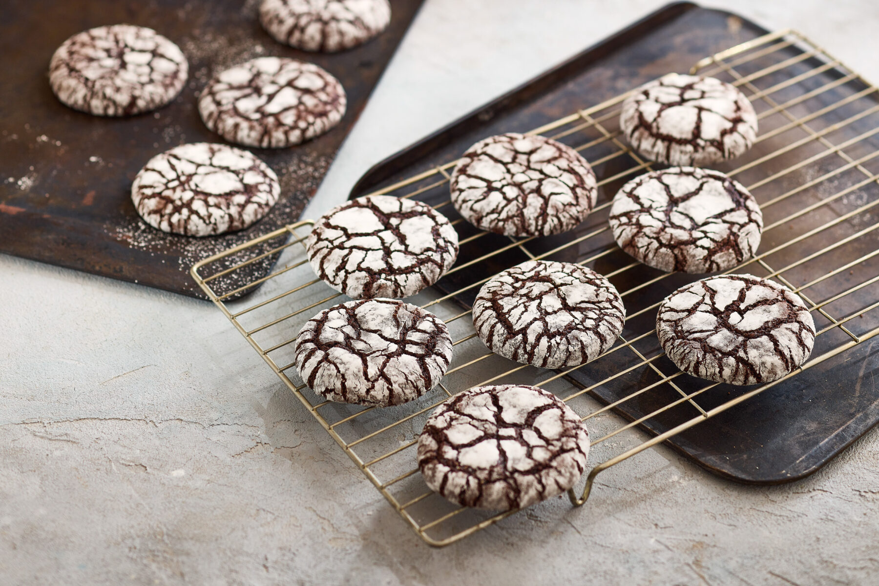 These classic crackle cookies are flavoured with cocoa and dusted in icing sugar before baking to get their signature look. Press down lightly and bake for 15 mins for soft fudgy centred cookies or press down more firmly and bake for 18 mins for crisper biscuity edges.