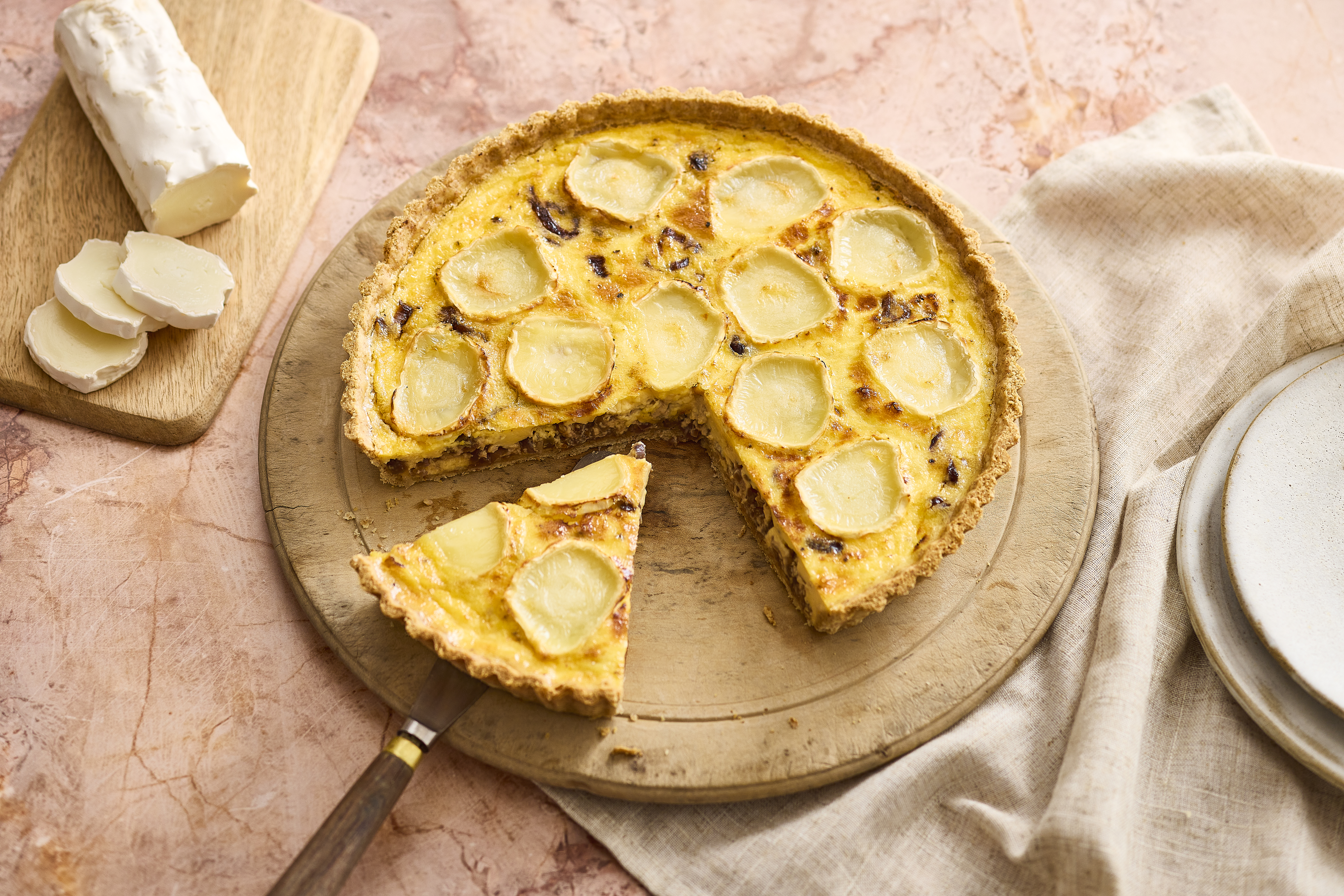 Caramelised onions and goats cheese are layered into a blind baked light brown pastry case, for a nutty base that stays crisp and buttery even when chilled to ensure no soggy pastry.